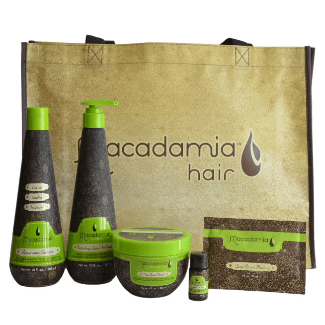 Set Macadamia Natural Oil edición limitada y exclusiva de Menuda Melena. Contiene champú 300ml, crema acondicionadora 300ml, mascarilla reparadora 236ml y Aceite terapéutico 10ml. Incluye regalo de una bolsa promocional de Macadamia y un sobre de mascarilla 30ml.
